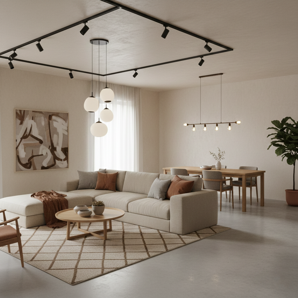 - Pencahayaan: Gunakan track lighting atau lampu gantung minimalis yang unik sebagai focal point.