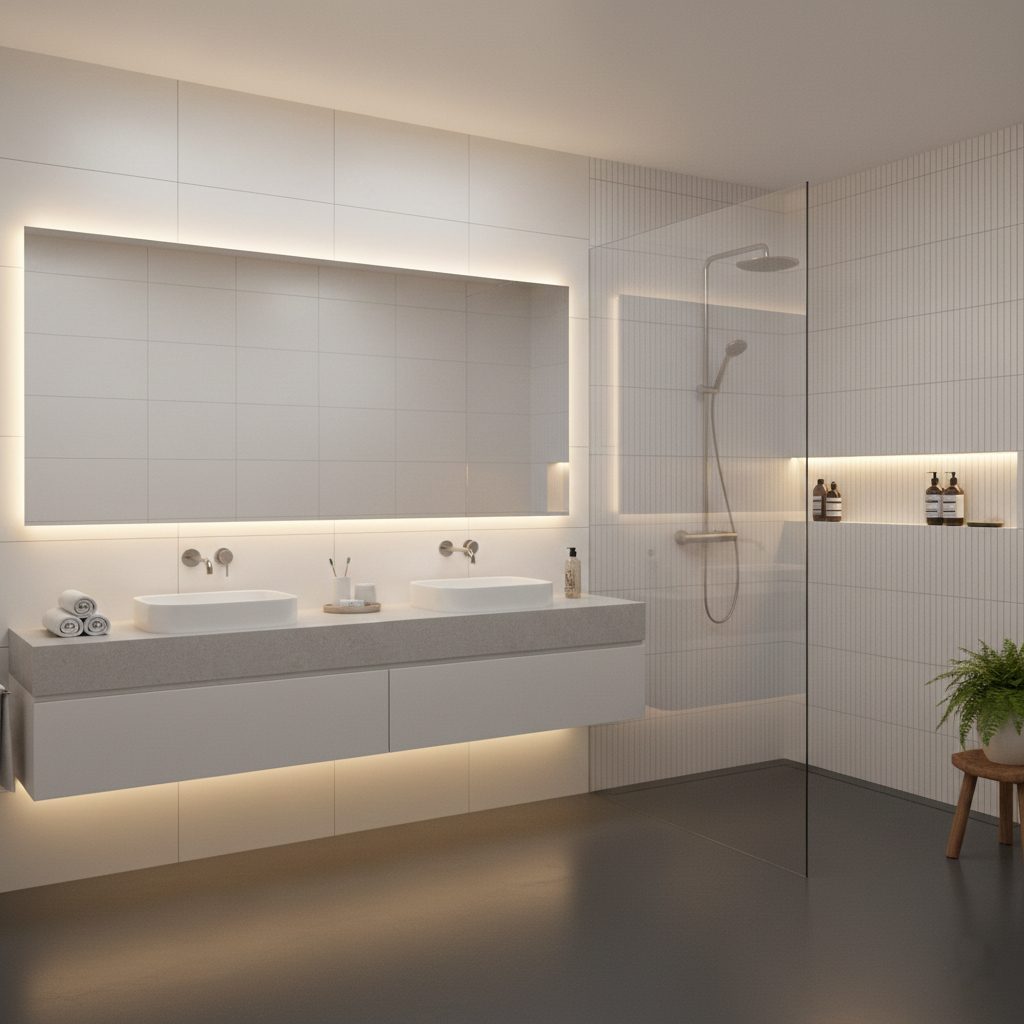 Ubah kamar mandi sempit menjadi area relaksasi. Kuncinya adalah penggunaan cermin besar untuk ilusi ruang dan pemilihan keramik yang tepat.