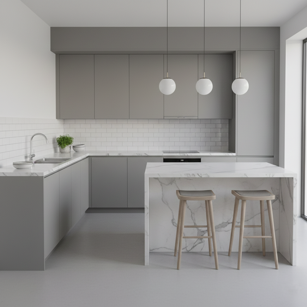 - Countertop: Marmer putih atau Solid Surface warna abu-abu.