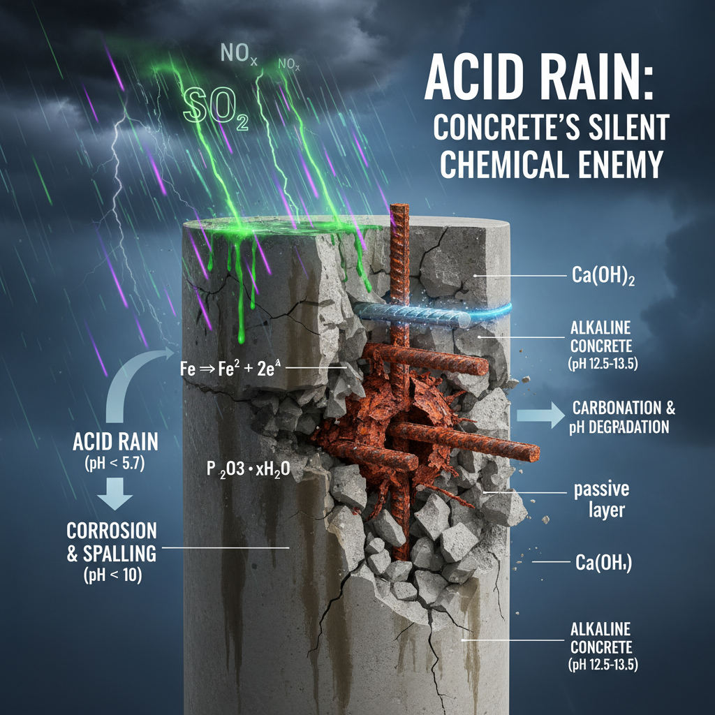 Intinya, air hujan menjadi musuh beton karena ia bertindak sebagai pembawa agen kimia korosif yang secara langsung menetralkan sifat basa pelindung beton, memicu korosi pada baja tulangan, yang pada akhirnya merusak material beton dari dalam.