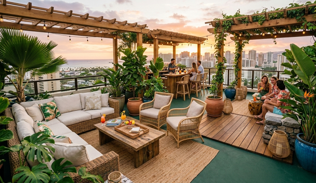 - Tropical Paradise: Gunakan dekorasi kayu (decking), tanaman hijau dalam pot besar, dan furnitur rotan.