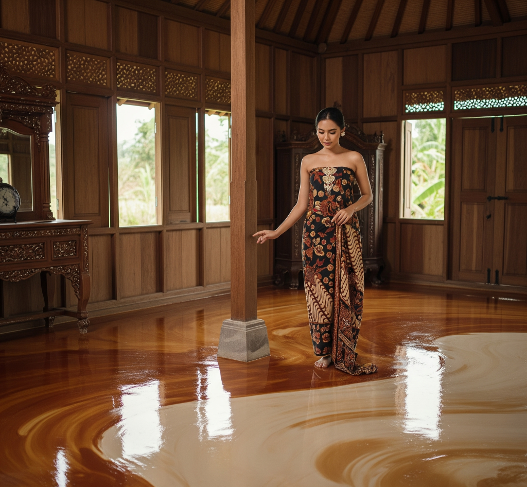 Bayangkan lantai rumah adat Anda yang memadukan kehangatan kayu dengan sentuhan modern. Epoxy dapat diaplikasikan di berbagai area: